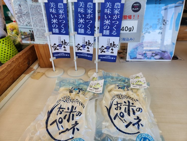 JA水戸青年部常澄支部のメンバーが開発した、地元産の「コシヒカリ」を使用した米粉麺「穂々の空」と短いパスタ「お米のペンネ」は人気商品。