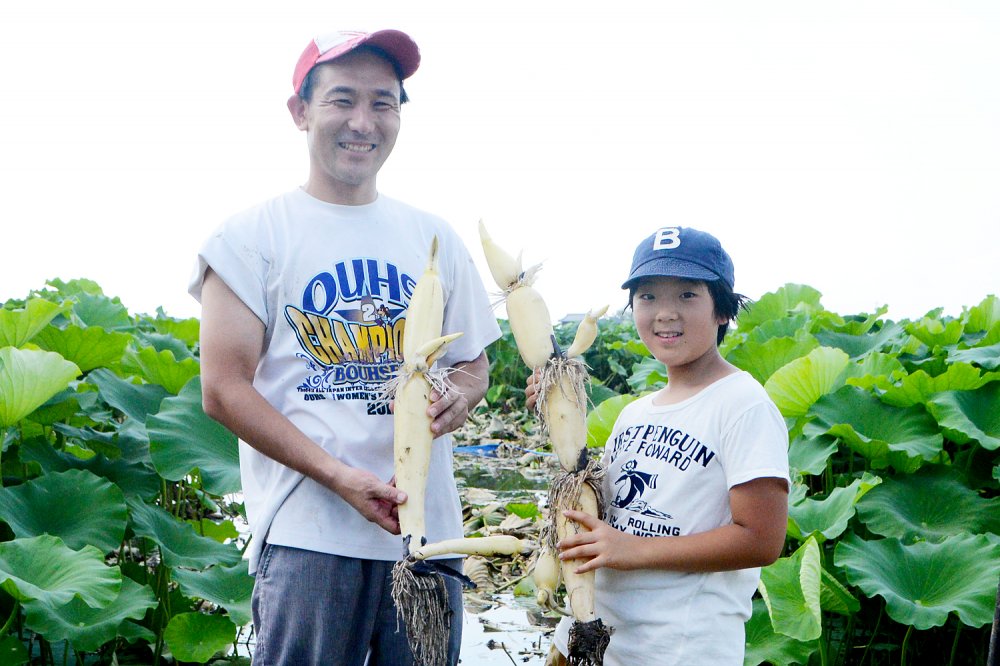 「れんこん三兄弟」の長男、宮本 貴夫さんと湊くん。
