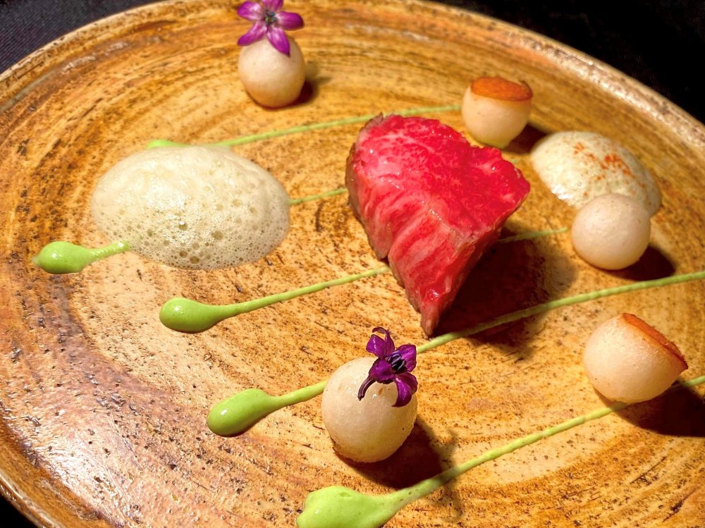 薪焼きで仕上げ、木の香りを持たせた常陸牛と、付け合わせの恵水と水キムチのマリネが乗った一皿。柴田農園のエディブルフラワーや旬のハーブの香りを抽出して作った“泡”を口に含むと、ハーブの苦味や花の香りなどで味覚がリセットされ、またおいしく頂ける。