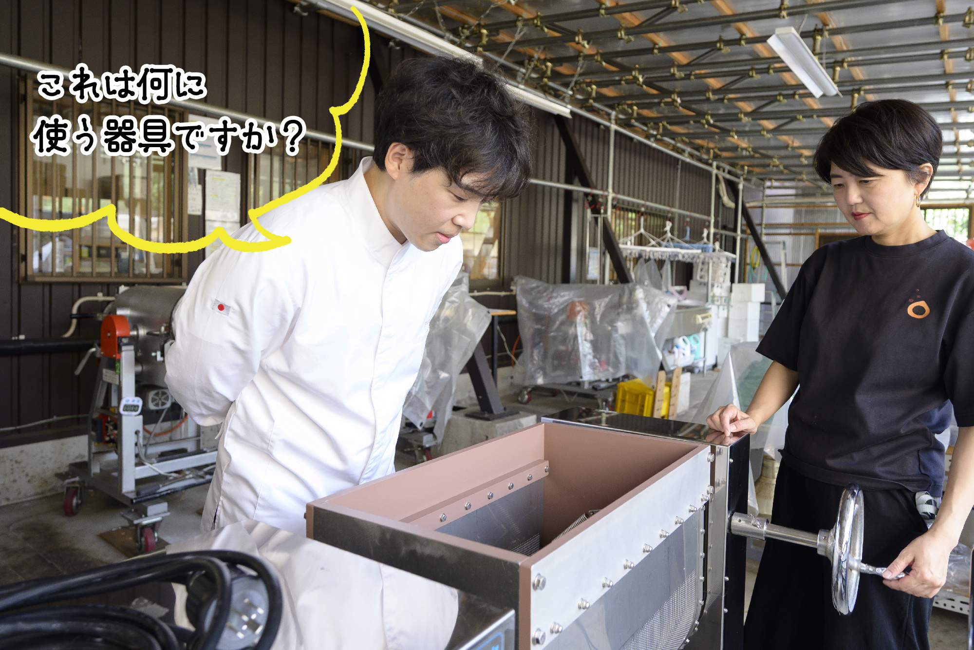 貯蔵庫の前には加工スペースがあり、器具がずらりと並んでいました。まだシーズン前で稼働はしていませんが、「これはなんですか?」とシェフの興味を引くものばかり。まず西野さんが紹介してくれたのは、焼栗を作る機械です。