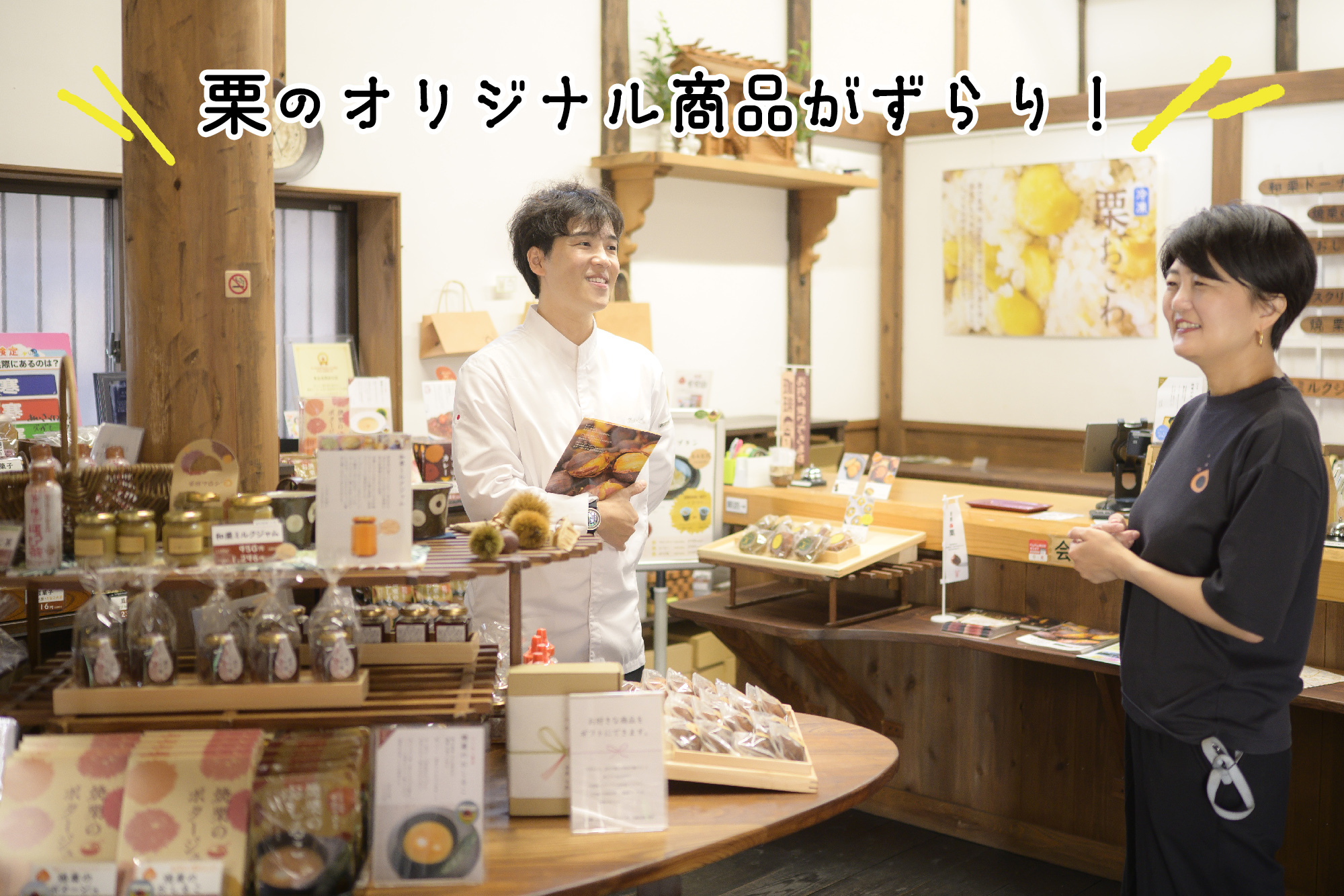 栗の加工品も豊富。お菓子はもちろん、栗のお茶や栗の渋皮入りうどんといった一風変わったものまで見つかります。