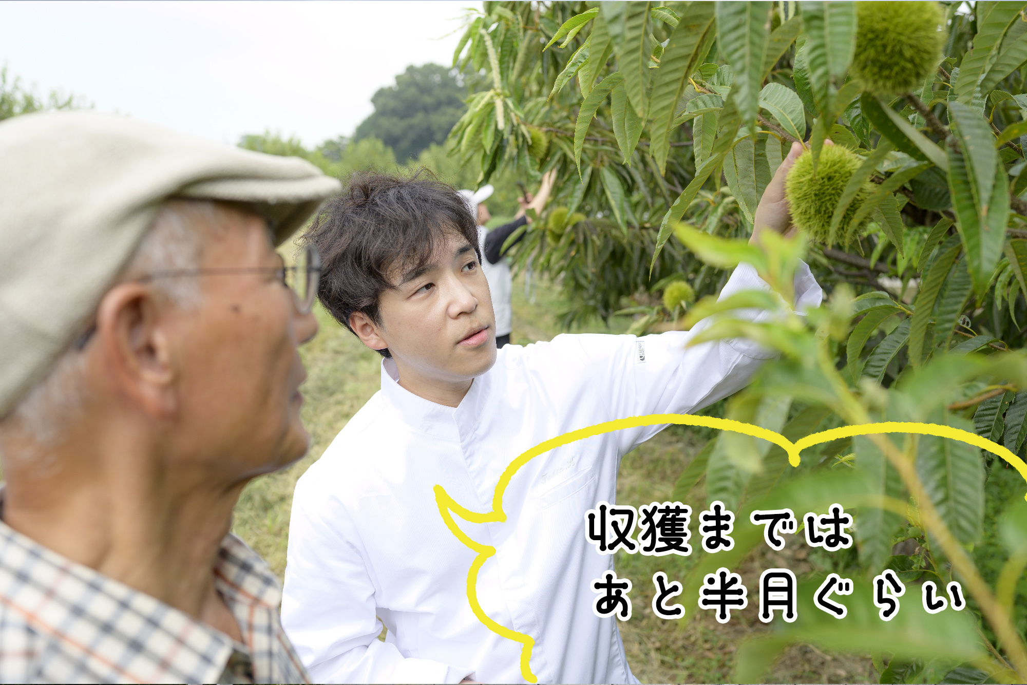 また、シェフは品種にも着目。「玉造の他には、どんな種類の栗があるんですか?」と質問するシェフに、よくぞ聞いてくれましたと西野さん。「栗には食べられるものとそうでないものがありますが、食べられるものだと20種類ぐらいあります。愛樹マロンでは、丹沢やぽろたん、筑波、石鎚(いしづち)などを栽培していますね。玉造の次は丹沢のシーズンです」と話す西野さんにシェフは「丹沢は僕も大好きでよく使っています!美味しい栗です」と頷いていました。