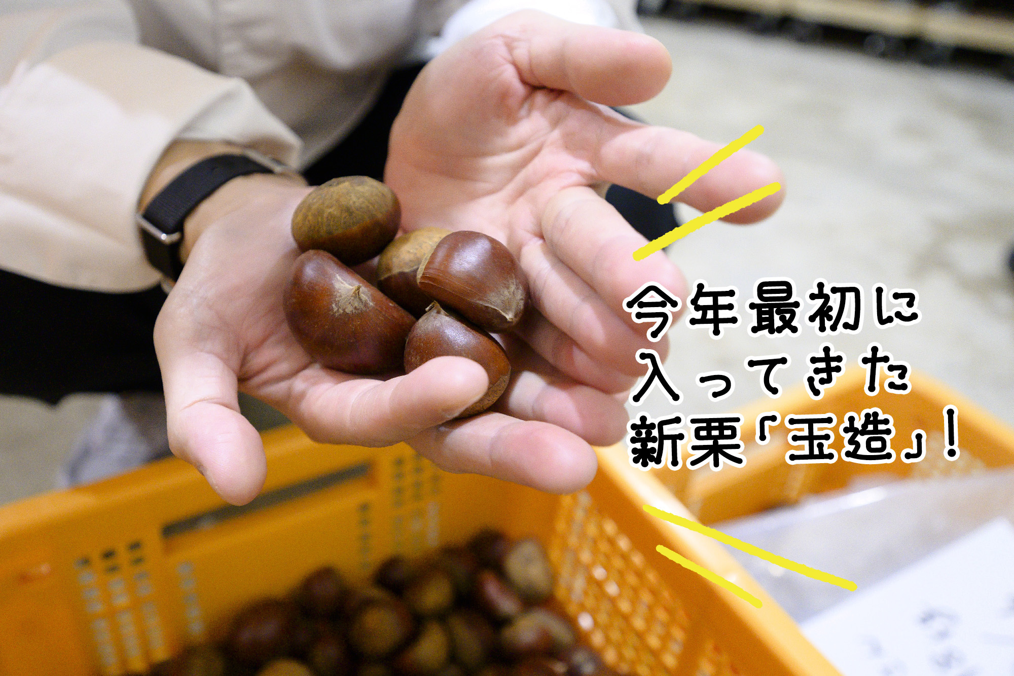 なんと、取材に伺った日(8月下旬)にちょうど今年初物の栗が届いたそう!トップバッターの品種は玉造(たまつくり)。「ぜひ見たいです!」と、貯蔵庫の中もご案内いただきました。