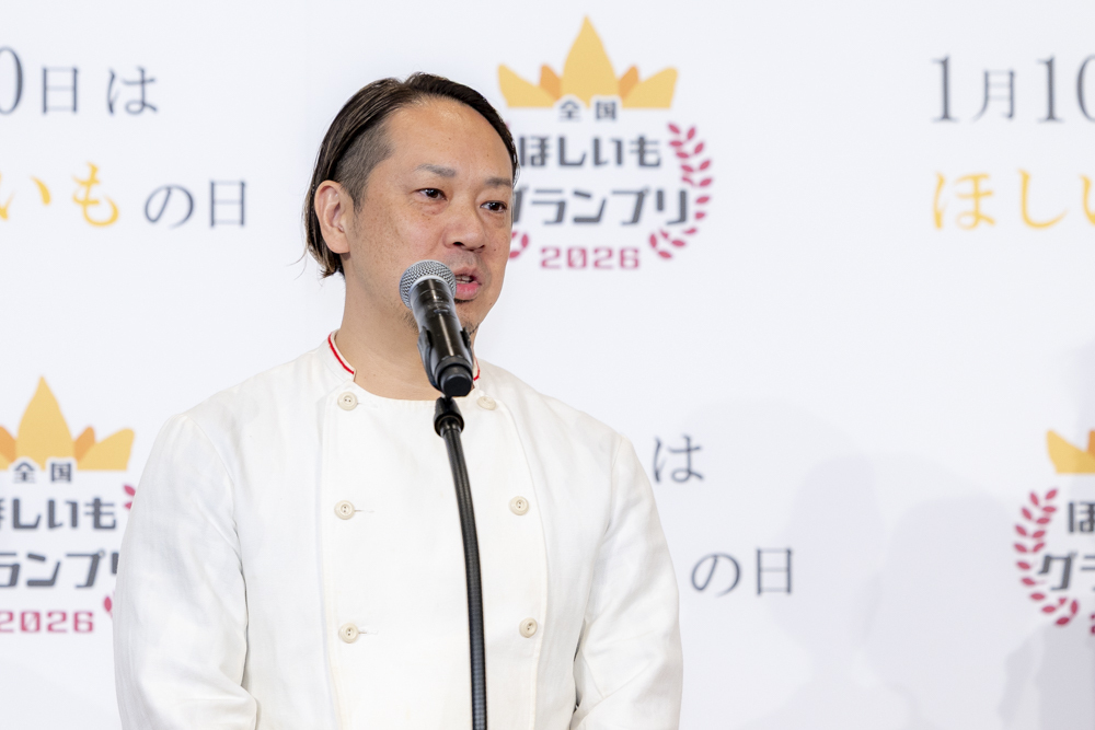 「本日は愛情たっぷりのほしいもをご用意いただき、ありがとうございました。昨年に引き続き審査員長として携わらせていただきましたが、今年は昨年以上にレベルが高く、完成度の高いほしいもが揃っていたというのが正直な感想です。審査は非常に難しく、自分なりに項目を細かく設けて評価しました。気を抜くと『美味しいな』『とても甘いな』と、ただ味わってしまう瞬間もありました。その中でも、グランプリに輝いたオオスガファームさんのほしいもは、素材選びから加工工程まで徹底的にこだわり抜いた逸品でした。見た目の美しさ、最初に噛んだときの柔らかさ、しっかりとした甘み、そして後から広がる香りとふくよかな甘み。とても素晴らしかったです」