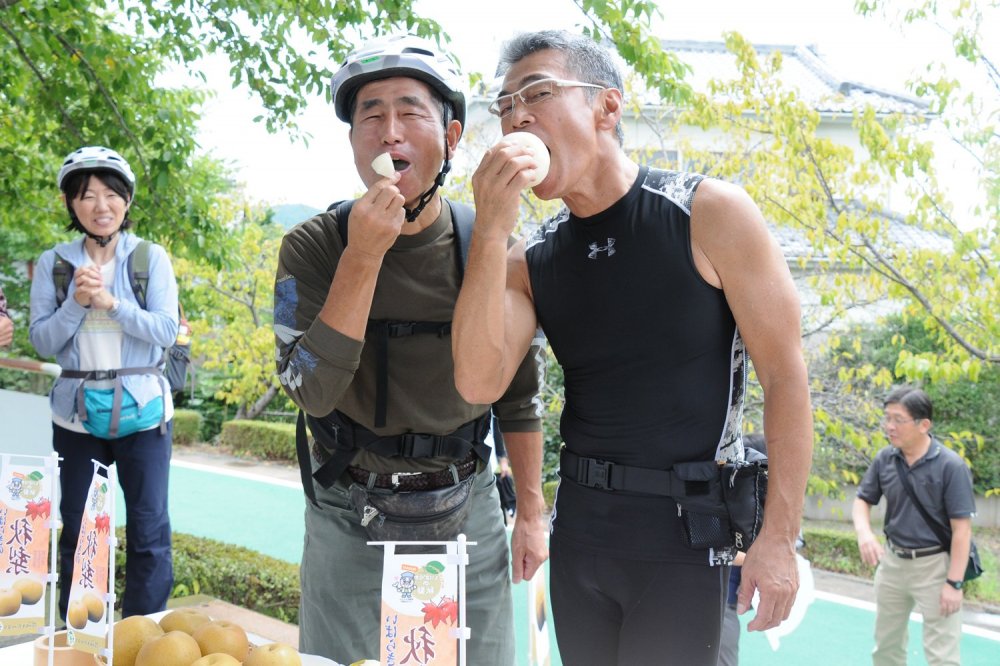 筑波休憩所に着くと、他のサイクリストと共に、いばらき美菜部が用意していた丸々1玉の梨にかぶりつき、「梨を食べたくて走ってきたから、おいしさはひとしお。美味しい、申し分なし!」スポーツと県の特産物がコラボした本企画については、「すごく良いと思います。スポーツとグルメはセットだと思う。グルメをめがけて走りに行く人も少なくない。梨だけじゃなく、生産量日本一の栗とか、大洗や那珂湊の水産物とか、茨城の様々なグルメとスポーツがセットにできる環境を作っていけたらと思う」と話しました。