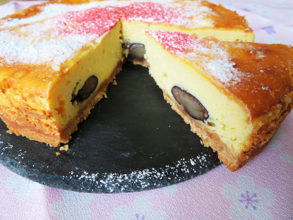 ベイクドチーズケーキの生地の中に常陸大黒の煮豆を入れて焼き上げました。