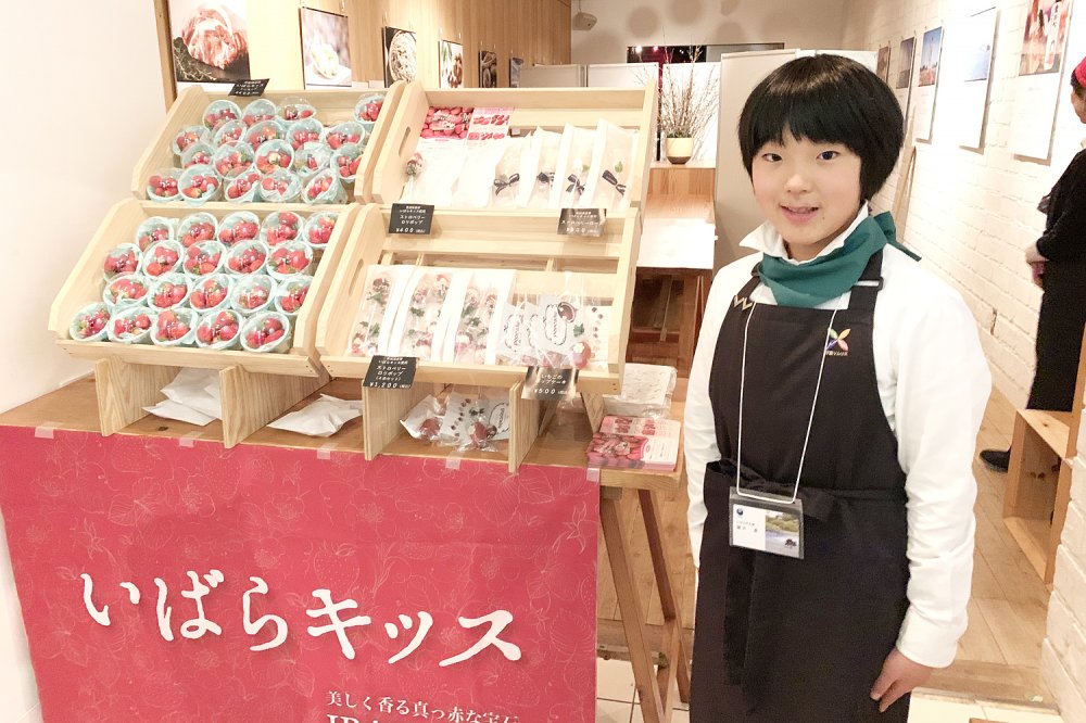 レセプションでは、「いばらき大使」緒方 湊くんが 茨城県産食材のPRを行いました。 レセプション終了後、いちごの販売のお手伝いもしてくれました。