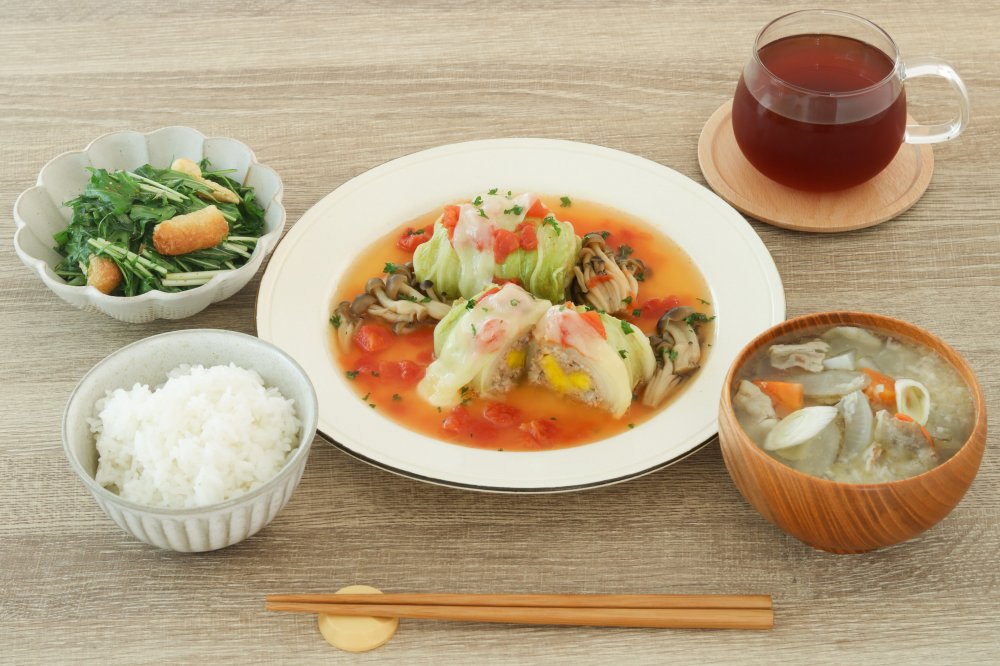 「さつまいも入りトマトロール白菜献立」1日分の目標野菜摂取量の350g以上(452g)が摂れて、しかも減塩!